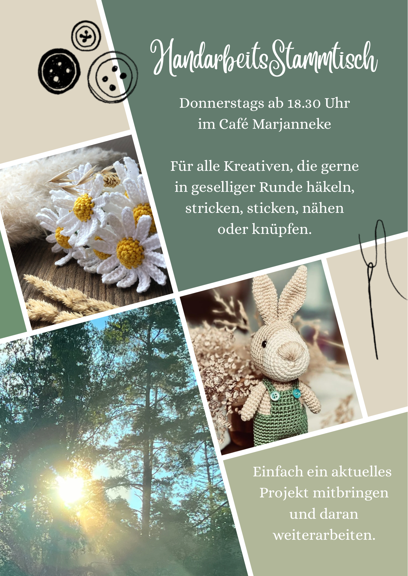 Handarbeitsstammtisch für alle, die gerne stricken, häkeln, nähen oder andere Handarbeiten machen. Bringt eure Projekte mit und tauscht euch mit anderen aus.